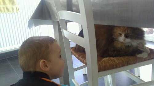 Tegelijkertijd doet Ilja van Russian roulette.  Risky business zou ik zeggen.  Marbel wordt het liefst gerust gelaten, tenzij ze zelf op je schoot springt, dan kan er een aaike vanaf.  “De poes zal je pijn doen” lijkt weinig effect te hebben.  Ervaring ook niet, want hij is er reeds twee maal in haar klauwen gevallen.  Tjah.