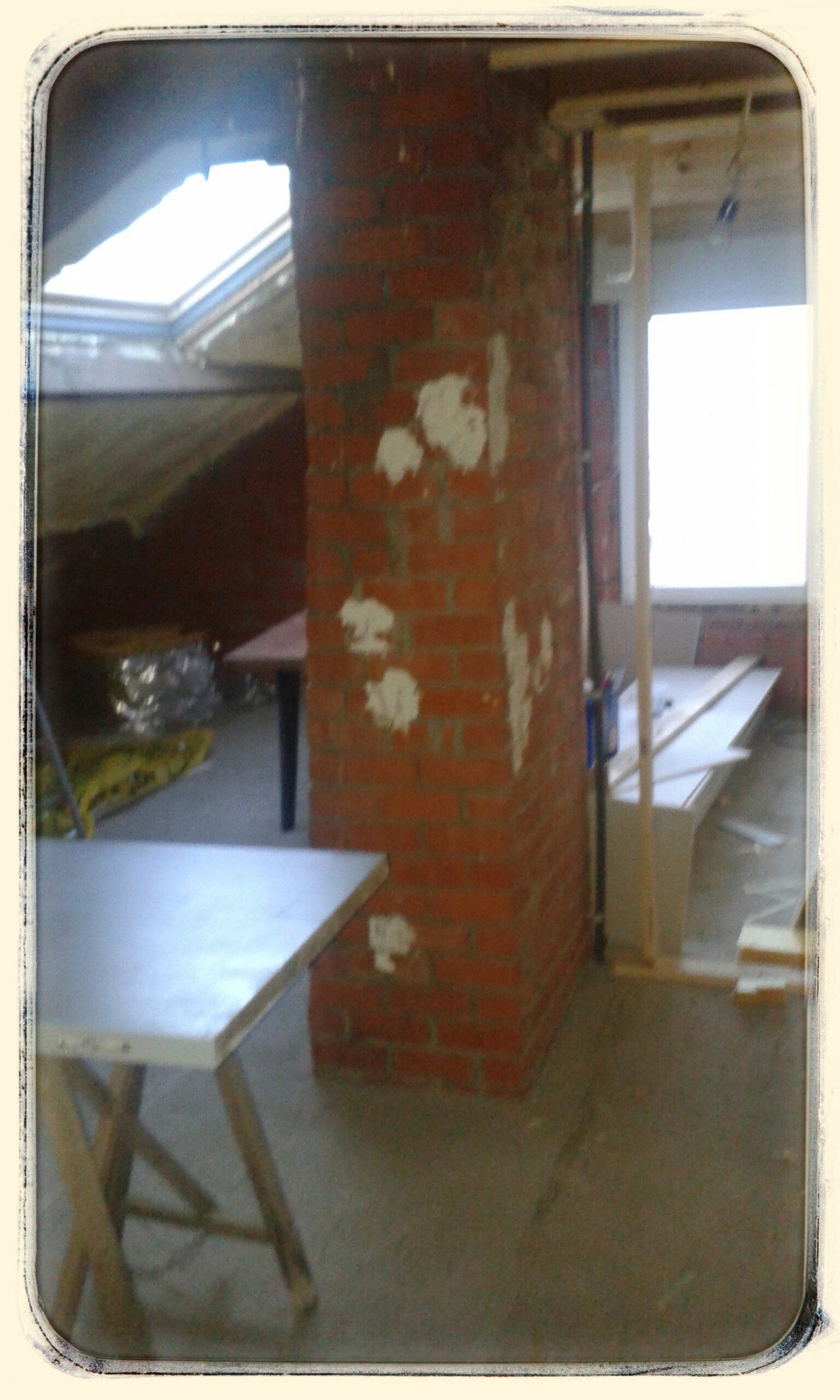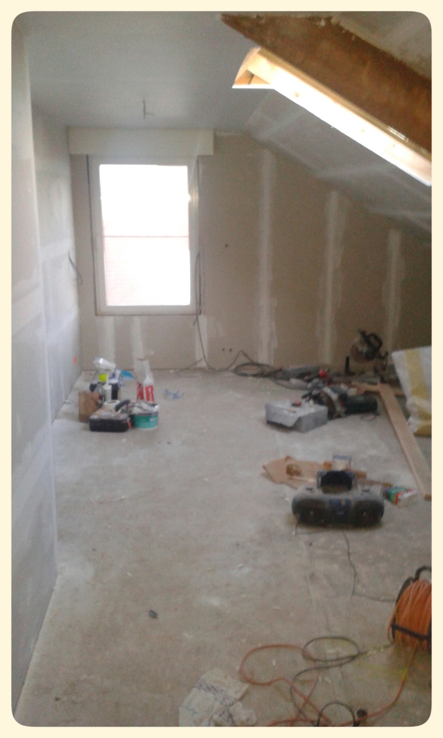 Enduiren en sjambrangs schilderen: mijn werkje.  Behangpapier kiezen en de verbouwingsrommel opruimen kan ik ook nog.  Maar plafonds schilderen en van die dingen dat laat ik over aan de mannen.  Ik vermoed dat -eens de laminaat er zal liggen- we al veel meer een echt kamergevoel gaan krijgen.