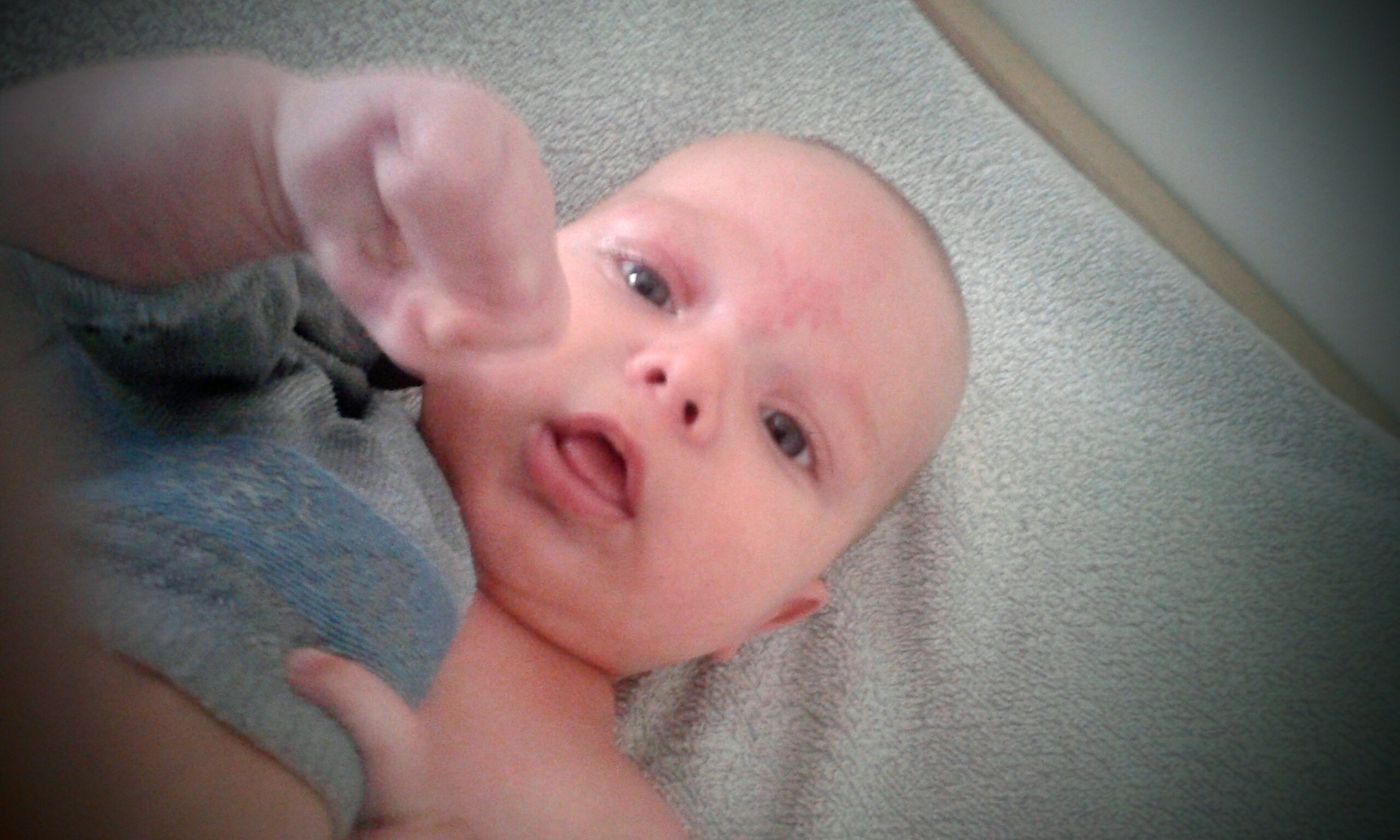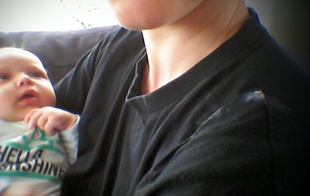11u: Als hij proper gewassen en gekleed is spuwt hij op mijn schouder.  Aah, the joy of being a mother!  Gelukkig ben ik nog steeds in mijn slaap t-shirt.