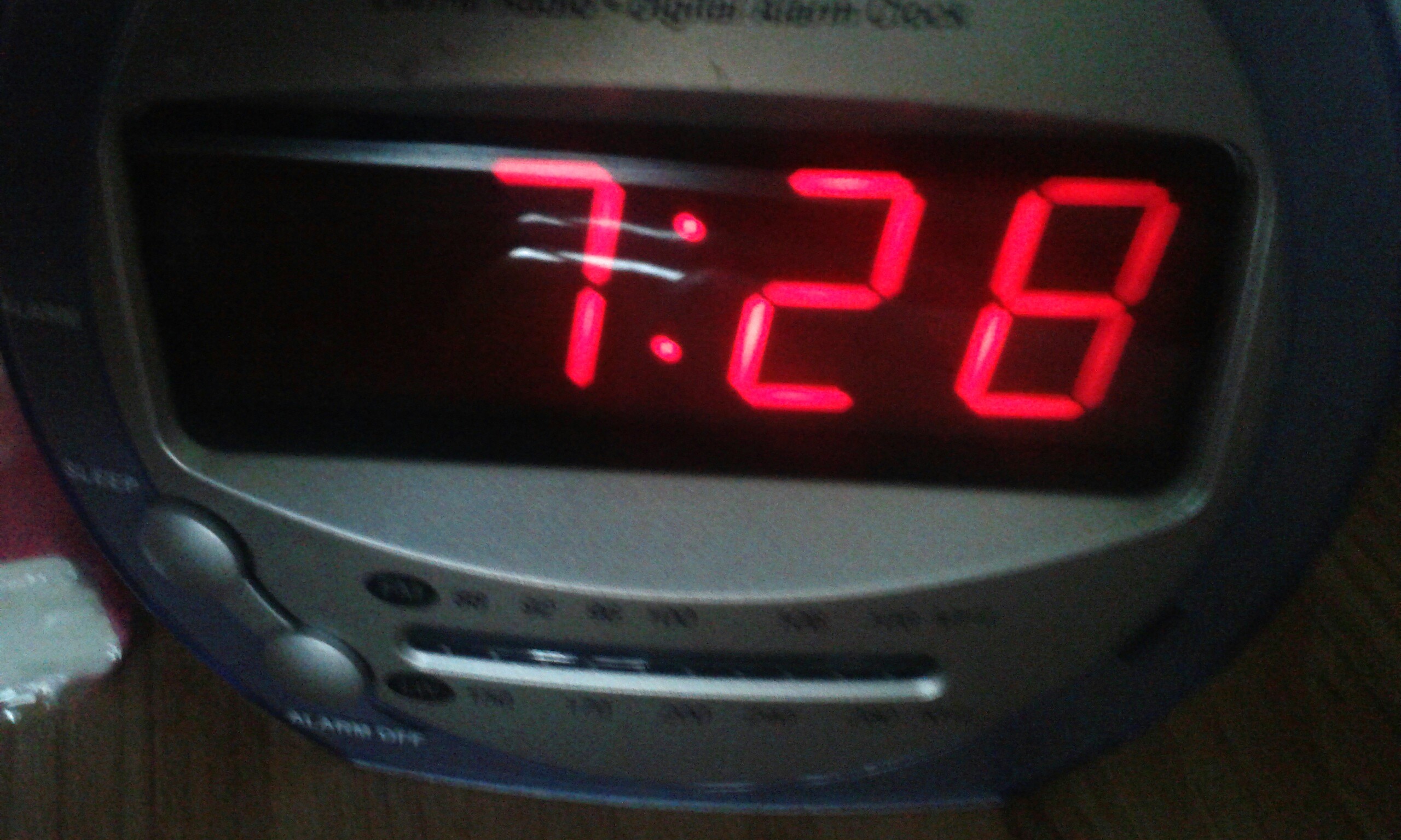 Het is 7u28 als we alle vier samen wakker worden.  Het voordeel aan kinderen die lang slapen (en konijntjeswekkers die opgevolgd worden): je kan zelf al eens langer slapen.  Het nadeel aan lang slapen: je kunt niet op je gemak wakker worden.  Onderweg naar het toilet duw ik de koffie aan,