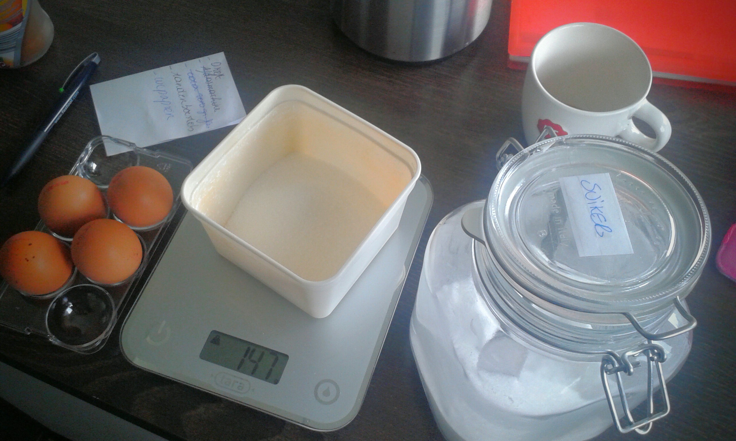 Na het ontbijt -als Pieter vertrokken is op zijn mountainbikeritje- start ik met het bakken van twee taarten.  Er is deze middag nog een laattijdig feestje voor Ilja’s verjaardag.  (de koffietas blijft in de buurt, ik heb veel te weinig gehad, veel te weinig zeg ik u!)