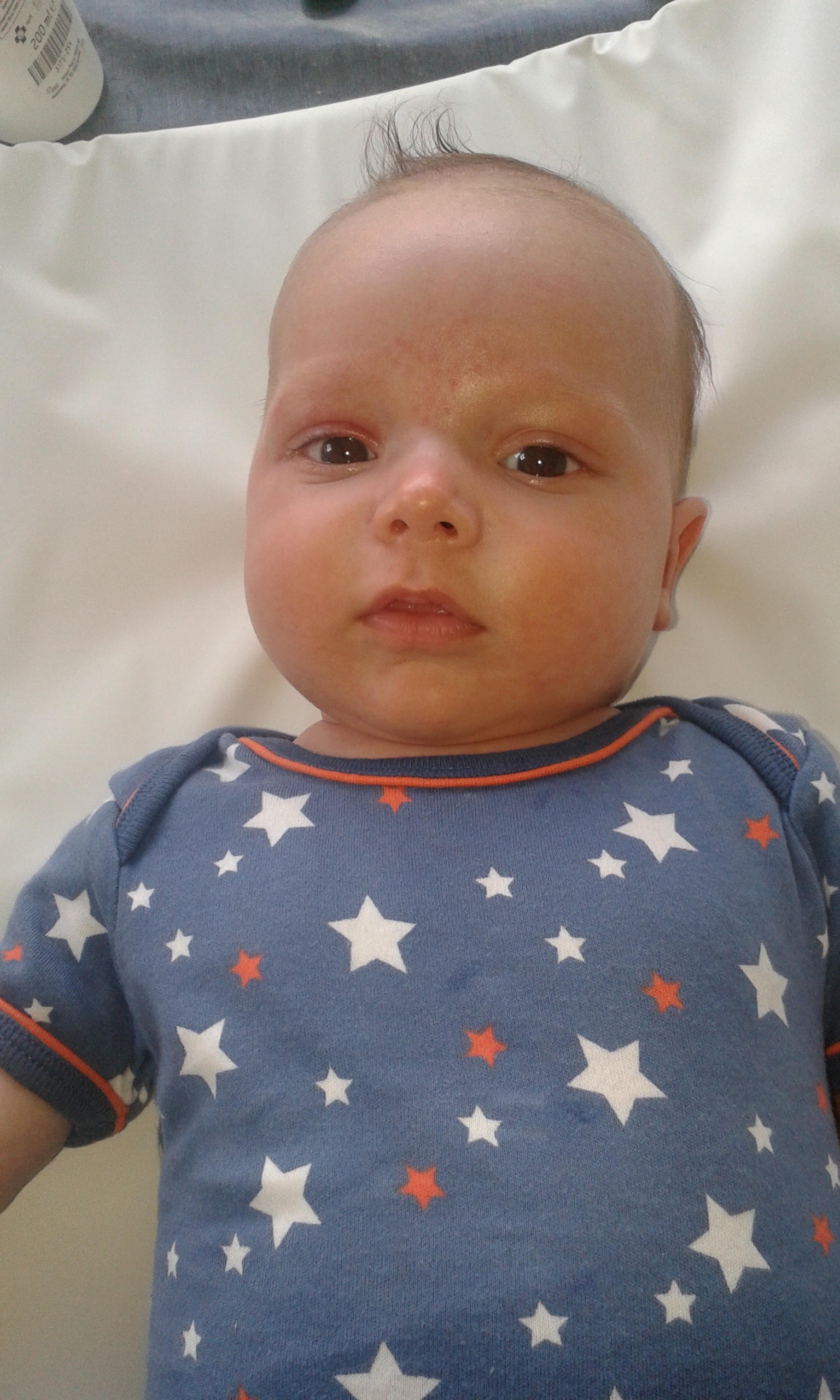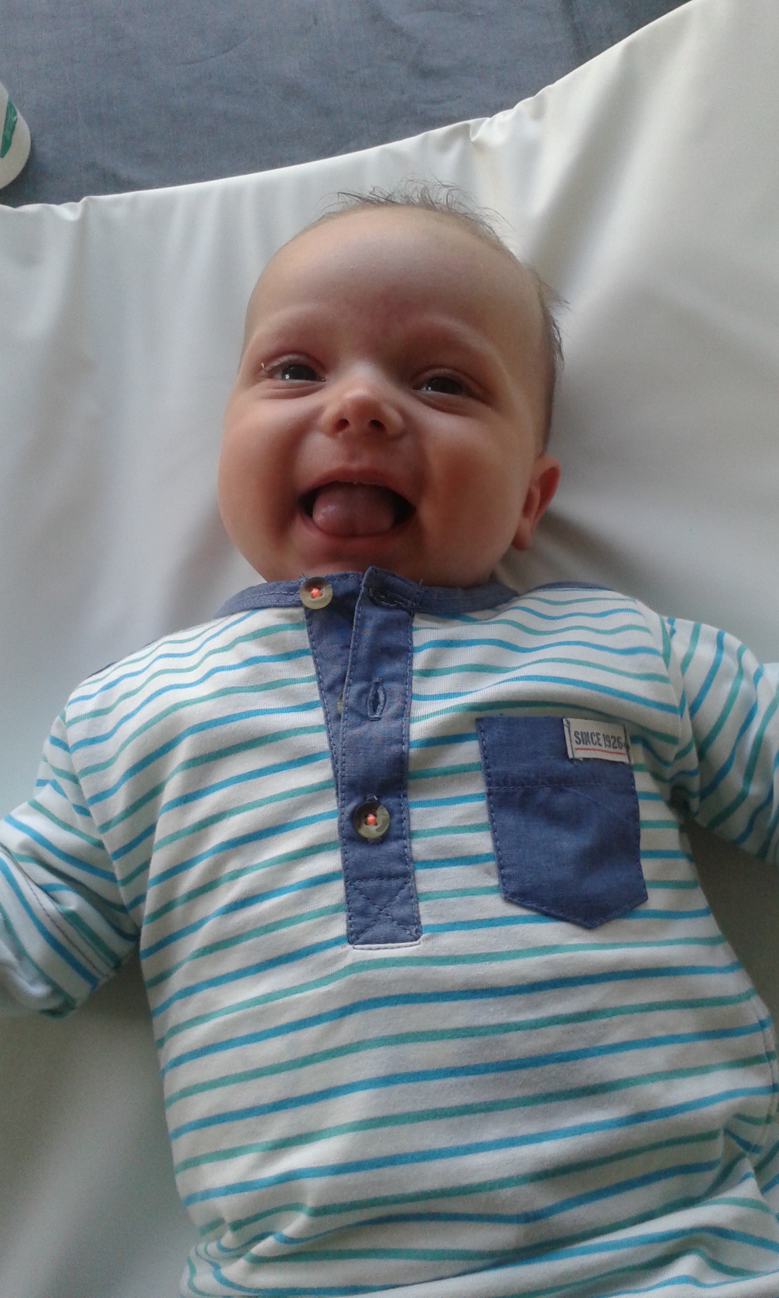 Hij lacht enorm veel en vlug, maar als hij weent heeft dat -net als bij veel baby’s-haha!- een reden.  Het hongerbleitingske, dat wil je liever niet meemaken, met onze hoge plafonds kan het nogal weergalmen hier, dan is de brulaap in hem wakker gemaakt.  Beware of the beurelmonkey!  En beurelen kan hij, vooral als het niet direct komt.  Het is ook aan hem te zien dat hij graag eet, met zijn drie maanden weegt hij 7,580 kg en meet hij 66,5 cm.  De grootte van een zesmaander dus.  We moeten misschien ook niet vergeten dat hij er al 2 weken oud uitzag bij zijn geboorte.  Dat was niet niks, die 4,410kg en 53,5 cm.