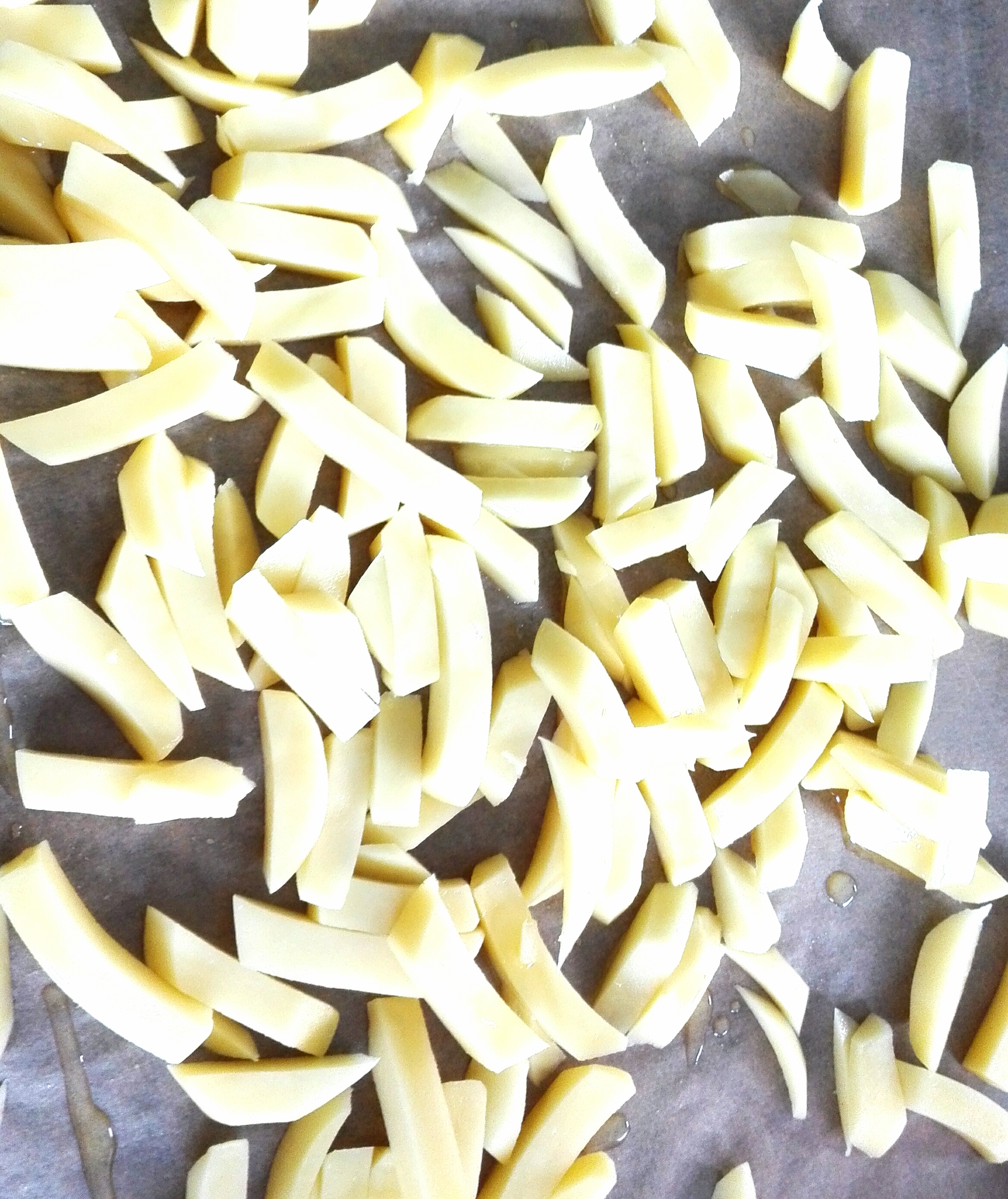 1. Ik maak de frietjes. Dep ze droog. Verwarm de oven voor op 180. Leg ze op een bakplaat, Klets olijfolie erop (niet teveel, vandaag had ik overdreven). 15 minuten. Een keer keren en nog eens 15 minuten. En dan bekijk ik het eens van ver en ik proef eens. En als het nog niet naar frietjes smaakt doe ik ze nog een beetje in de oven. Laatste handeling dan nog eens tot ze goed zijn. Zoiets. Hey, dit is hier gene foodblog he 😉