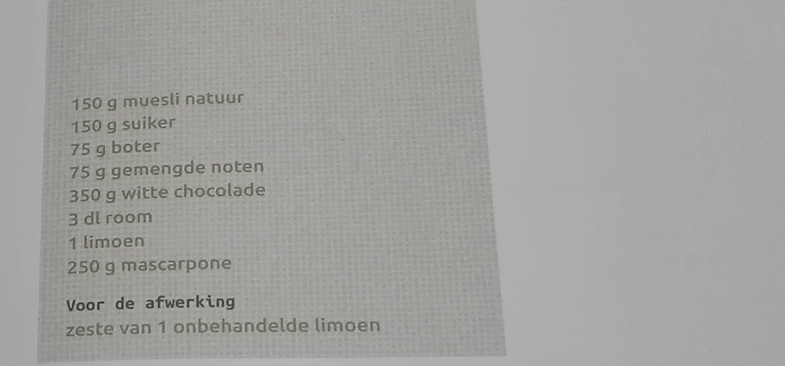 “Hak de noten fijn.  Smelt de suiker in een pannetje.  Voeg de boter toe en meng met de muesli en noten.  Verdeel het mengsel over een met bakpapier bedekte springvorm en strijk glad.  Laat afkoelen en opstijven.”