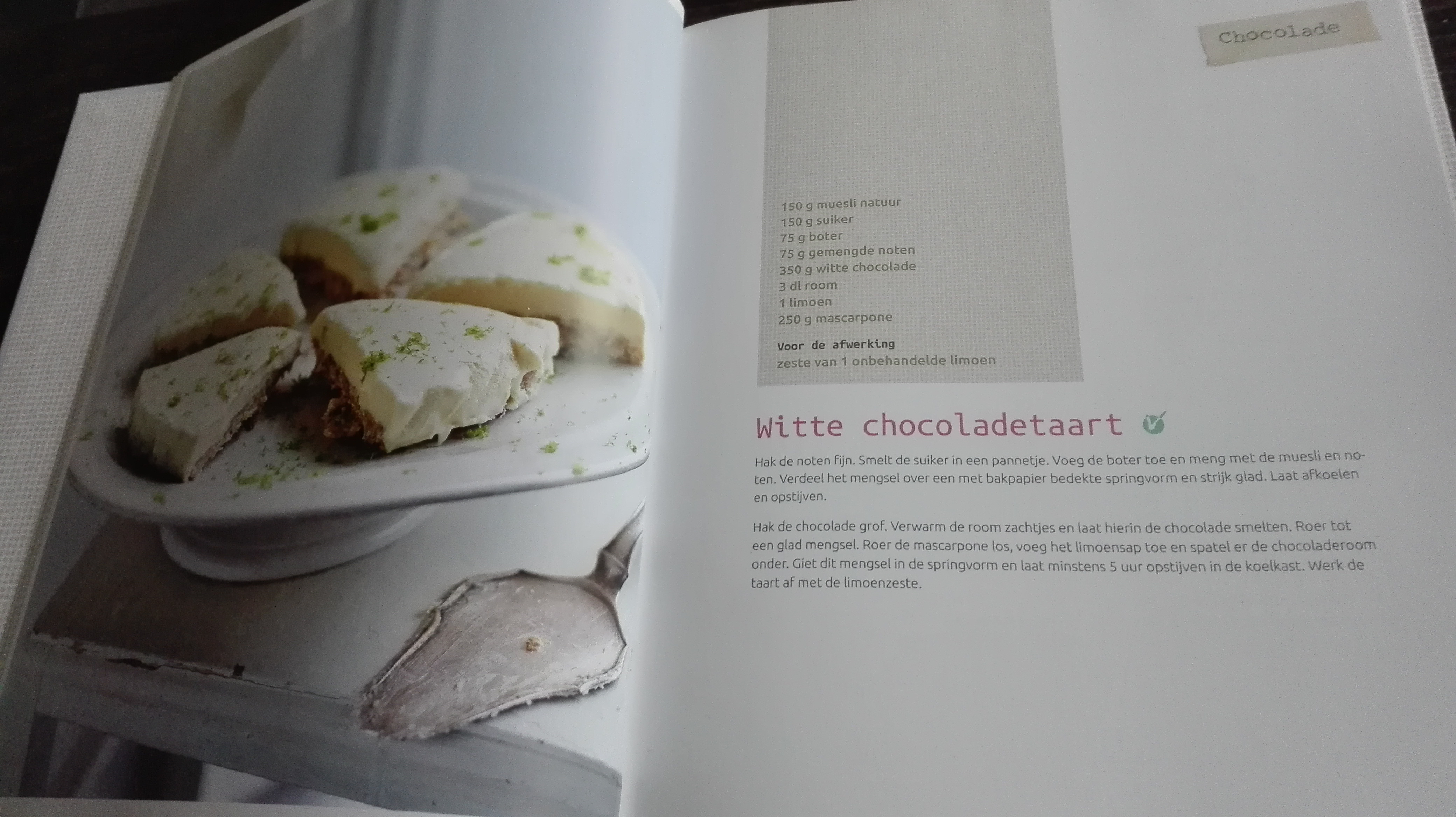 Maar gow, het recept. “Witte Chocoladetaart”.  Oh yes, ik koos voor vetzakkerij. (of course, my dearest).  Bij Haaike had ik gelezen over een kookboekenweek ,het  sprak mij wel aan, dus ik nam mijn laatste kookboek “Taarten Zonder Oven” erbij voor het dessert.