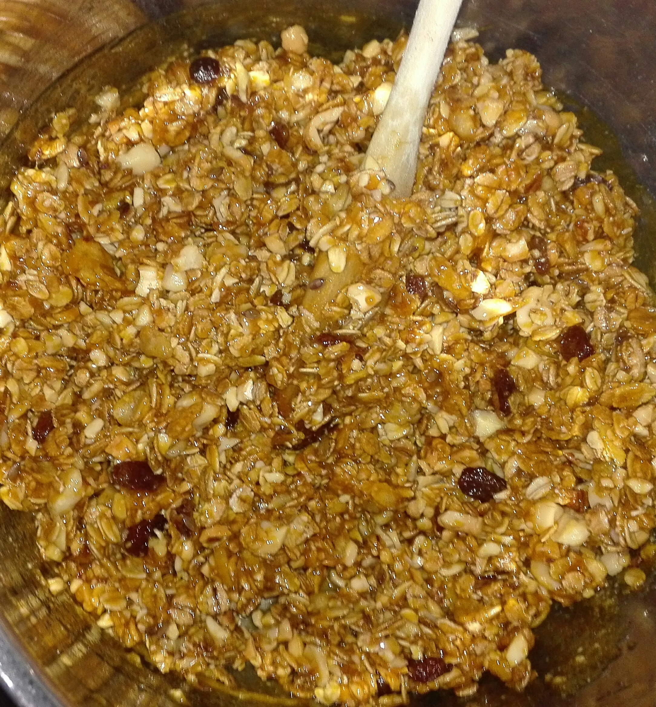 Muesli gemengd met noten en gesmolten suiker ziet er alvast zo uit.  Zorg dat je een stevige lepel hebt want het is een stevig goedje om door te malen.