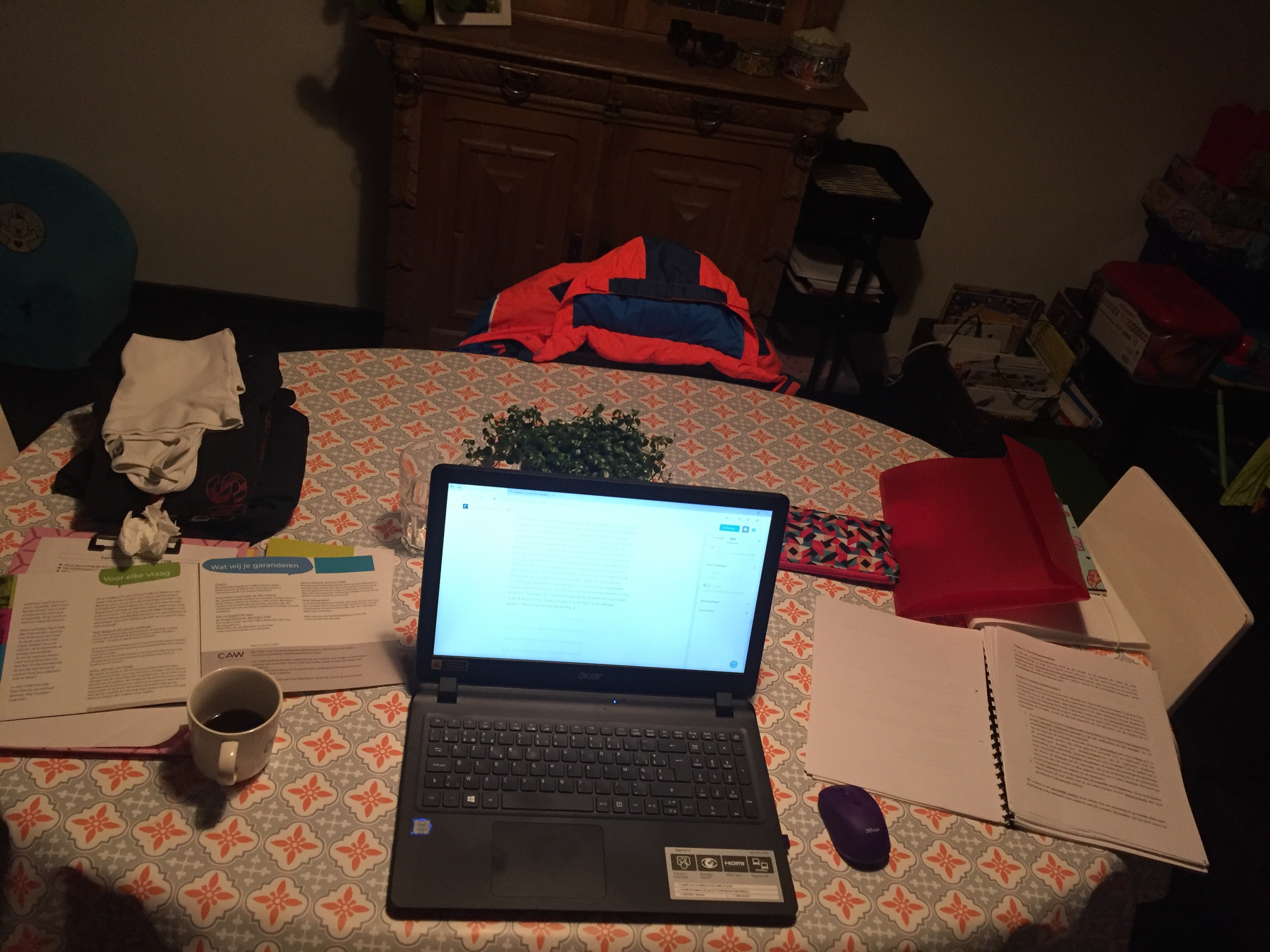 Zo ziet de livingtafel er op dit eigenste moment uit. Deze blogpost, een half afgewerkte schooltaak, een training van Ilja, verfrommelde papiertjes en een Chiro-jas die feitelijk aan de kapstok hoort.