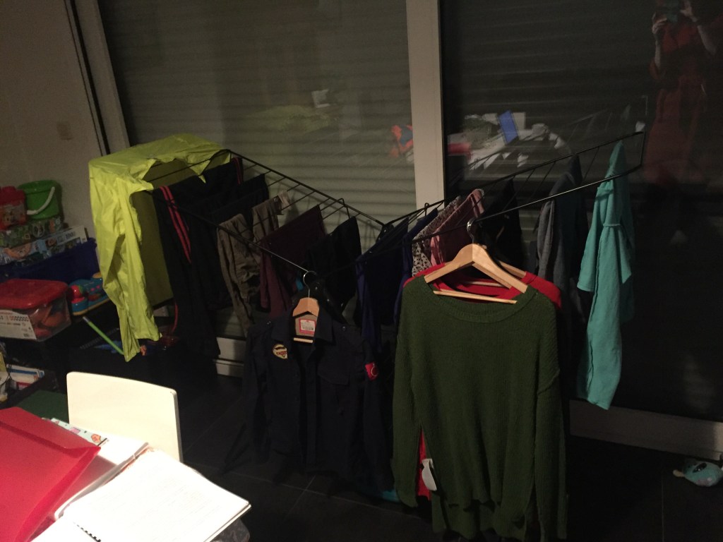Aan de andere kant van de leefruimte vind je een wasrek en als je goed kijkt mezelf in mijn peignoir. Er hangen wat kleren bij die al enkele dagen droog zijn maar in feite nog niet in de kast zijn geraakt….