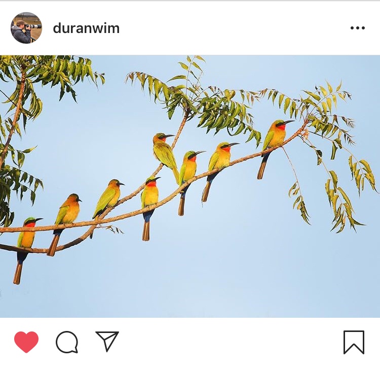 Behalve kinderpsycholoog en ornitholoog is Wim ook een fantastische fotograaf. Je zou gewoon van vogels beginnen houden als je de benamingen van die diertjes erbij leest. Valleigraszanger, Maskerwever, Juveniele Geelsnavelwouw. Wow! Mijn favoriete foto tot nu toe is de onderstaande van de Roodkeelbijeneters.
