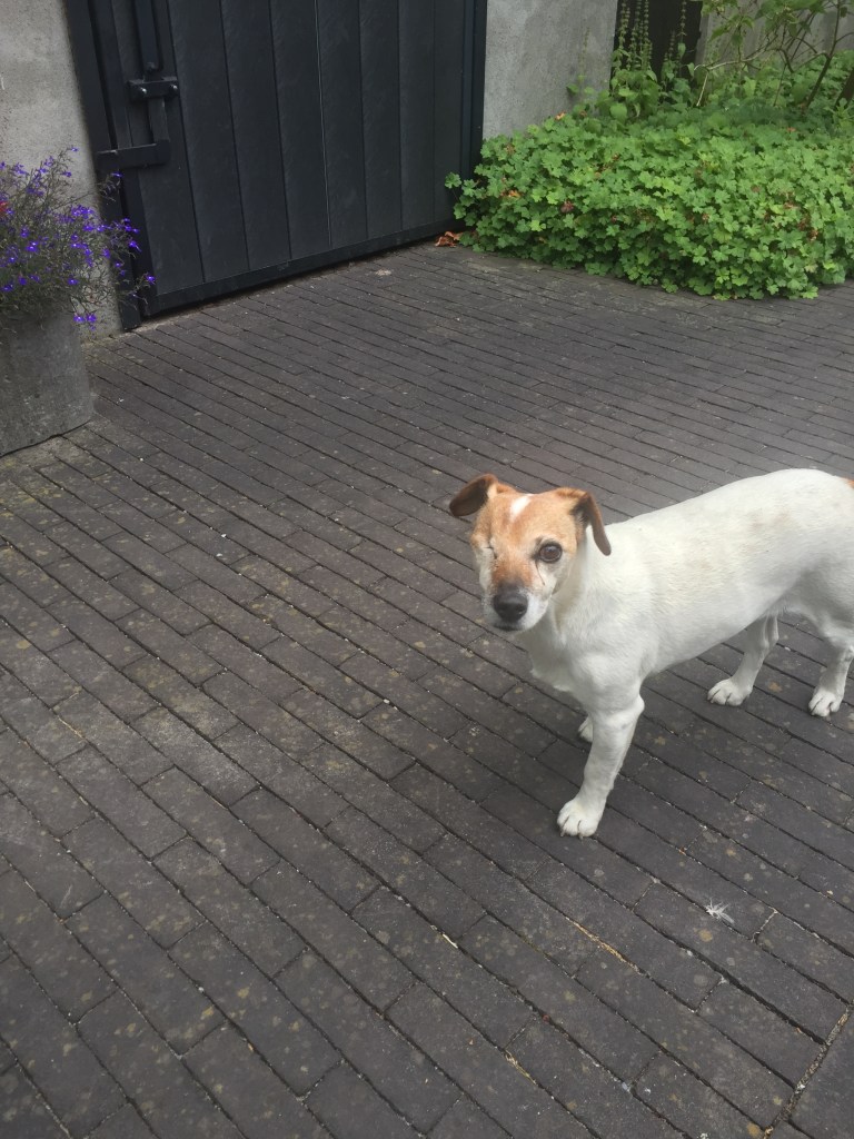 Rudy die one-eyed-dog wil gerust gelaten worden maar toch wentelt hij al eens in het gras hier bij ons huisje.