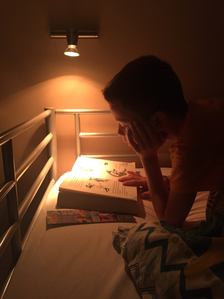 Ilja kiest er voor om iets langer in bed te blijven liggen met zijn boek, mijn (boeken)hart ontploft bij dit aanzicht.