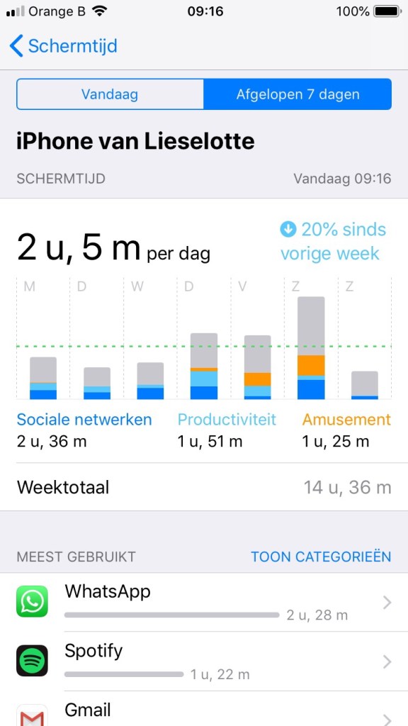 Amai, mijn schermtijd is massaal veel hoger. Maar Waze staat op 1, dat telt niet vind ik. En muziek die op werk de hele tijd staat te spelen telt ook niet vind ik. Maar zonder die elementen kom ik vast nog een pak hoger dan jou uit want ‘k heb best wel veel facebook, instagram, twitter, slack en messenger. Geen whatsapp.