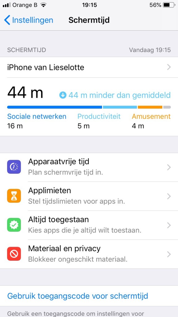 Mijn schermtijd was 2uur en 5 minuten en was daarmee met 20% gedaald. Omdat ik weinig vergelijkbaar materiaal heb weet ik niet in hoeverre dit eigenlijk veel was of niet. Vandaag zijn we nog eens drie weken later: