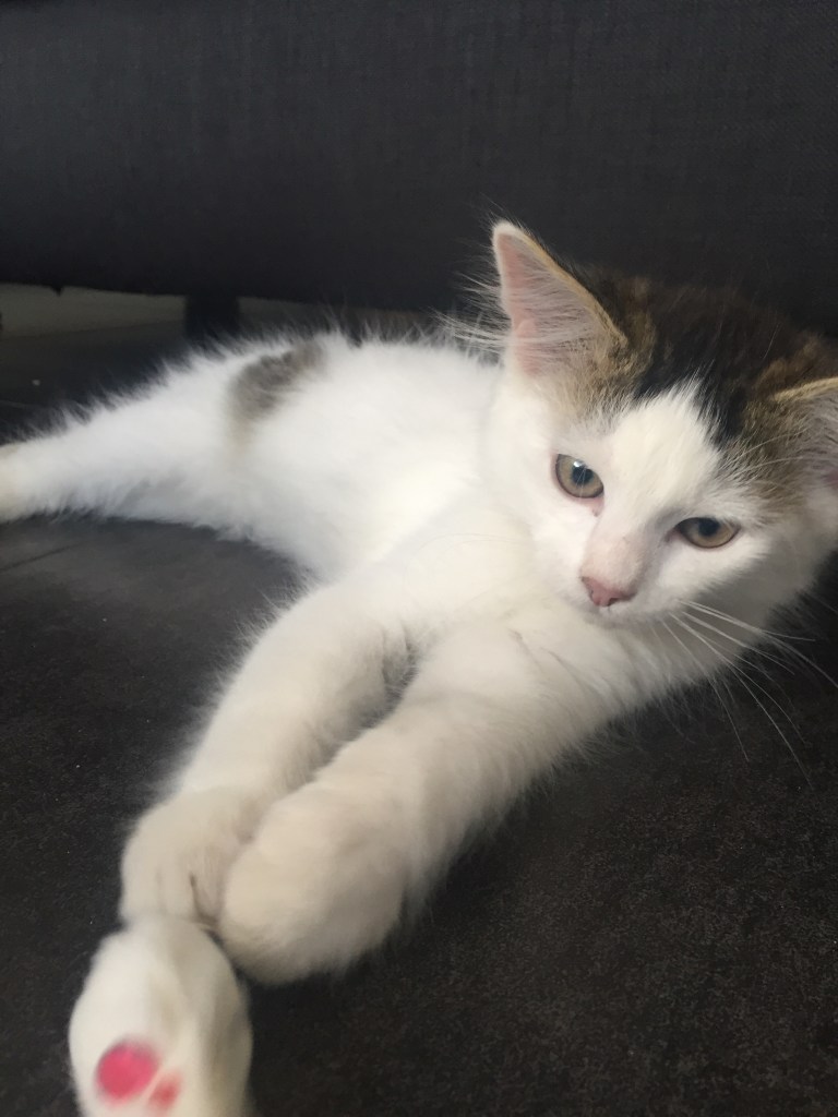 Geknuffeld en gevloekt: met en op Frankie onze nieuwe kitten. Ze (’t is een zij) is cute as hell en enorm kindvriendelijk. Lees: ze laat zich overal rondslepen door de kinderen zonder hun ogen uit te scharten. Maar tegelijk houdt ze ook van klimmen in mijn vliegenraam en schijten in de monstera die ik vorig jaar voor mijn verjaardag kreeg van Renilde. Daarna kijkt ze zo met haar koddige kattenkopje…
