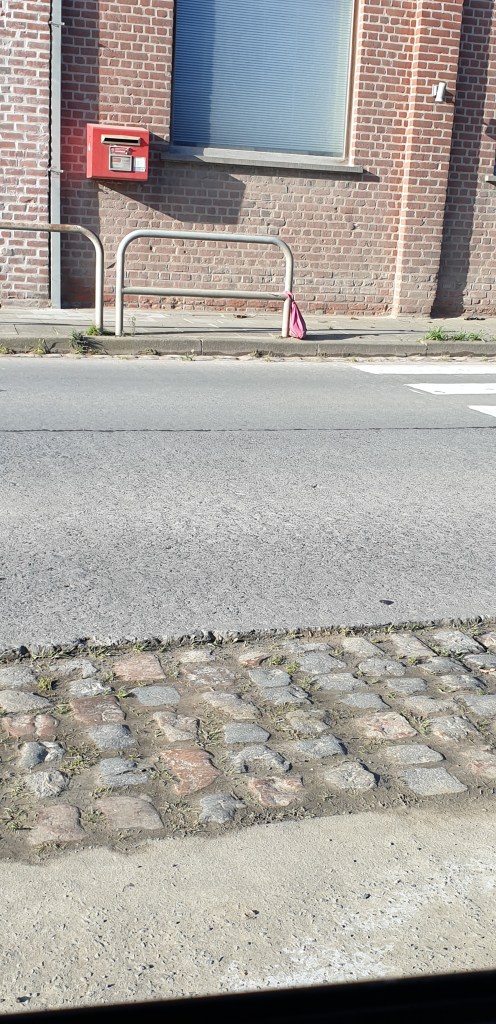 Acht weken later. Een volgestouwde dag waarbij ik constant opgehouden word door trage mensen in de supermarkt, verkeersomleidingen, problemen aan balies. Kortom: geen tijd voor niets en opgejaagd tot en met. Ik passeer weer bij dezelfde plek. En dan….beslis ik om het gewoon te doen. Ik stop aan de overkant. Ik moet eerst vijf auto’s laten passeren omwille van de drukke baan en ik pruts de zak los van de vangrail. Hij voelt licht aan maar omdat hij reeds verschillende keren is natgeregend krijg ik hem bijna niet open.