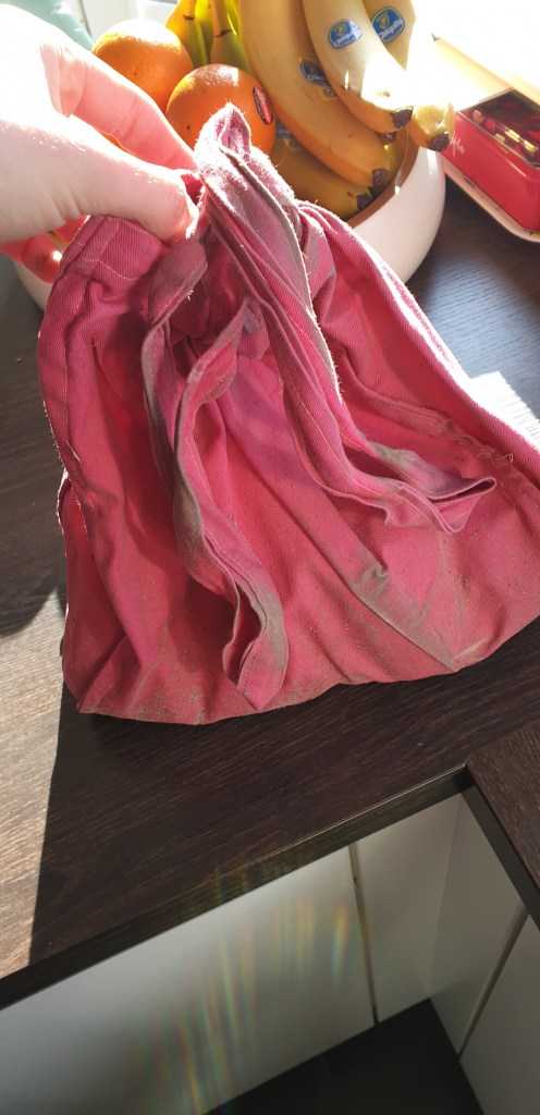 In de eerste week zag het er aanlokkelijk uit. Een rode zak, ze hangt nog mooi vastgebonden aan de bovenkant van die vangrail. Is het een cadeautje voor die mensen die daar wonen? Misschien heeft iemand wel verse appels geplukt en niemand thuis gevonden bij het afgeven? (Going all Roodkapje over here). Misschien stond er ginder wel verse appelmoes op het menu? Maar niemand pikt de zak op. En ik blijf passeren.