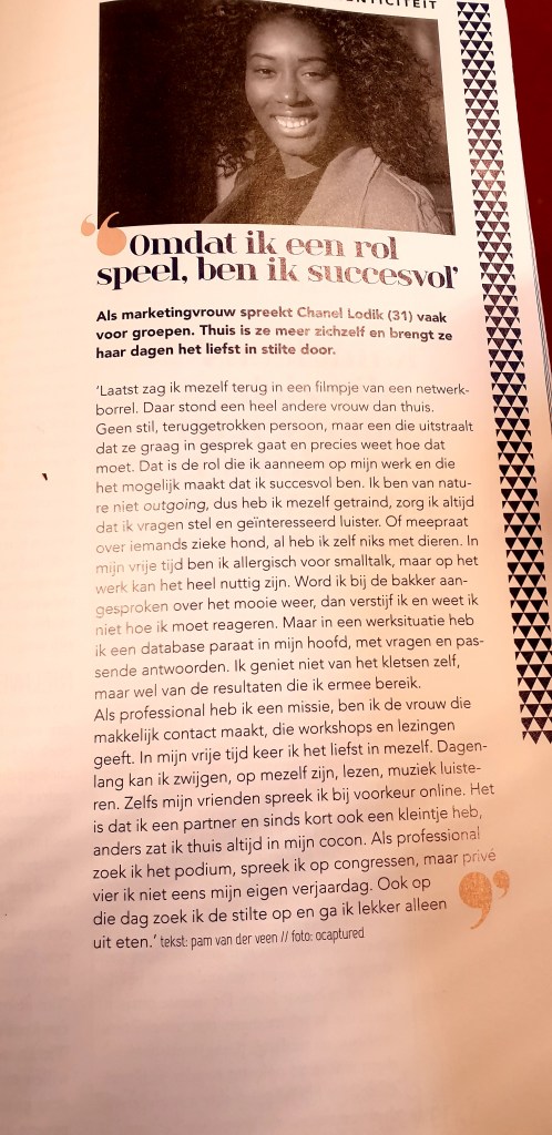 Ik deed niet anders dan fronsen en hoofdschudden. Hoe lastig moet het niet zijn om constant een rol te spelen op je werk. Een façade optrekken en je volledig anders voordoen dan je bent. Vreselijk! Ik had te doen met de dame in het interview!