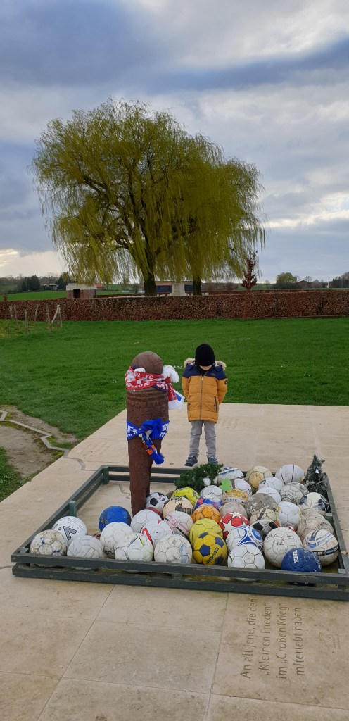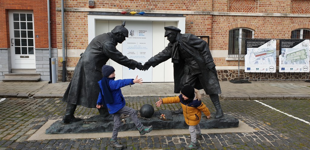 In Mesen kun je ook de plek bezoeken waar Britse en Duitse soldaten tijdens de eerste wereldoorlog op kerstmis 1914 hun loopgraven verlieten om samen te voetballen en Kerstmis te vieren. Vandaar ook het standbeeld op het marktplein (zie tweede foto).