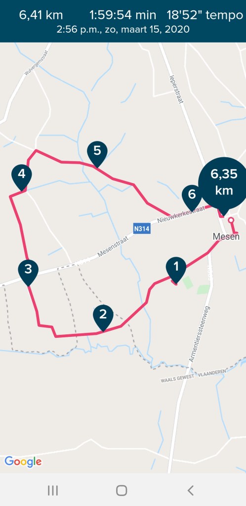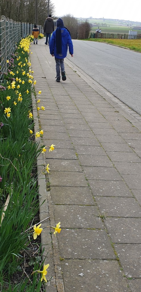 We slurpen elke twinkelende zonnestraal op deze week. Om te vermijden dat de kinderen vegeteren in de zetel gaan we dagelijks wandelen. Soms is dat de toer van 4,5 km naar “de platse” ofwel kiezen we om ons te verplaatsen. Zondag wandelden we een historische route in Mesen, zo’n 25 km hier vandaan. Educatie remember?