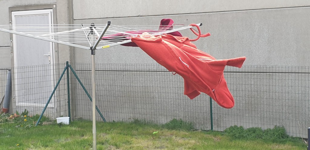 Mijn kamerjassen wapperen aan de waslijn. Weekendwasjes. Ze voeren een strijd met de snakkende wind, het lint uit mijn rode kamerjas moet het onderspit delven en wentelt binnen de kortste keren door het grasplein. De graaiende armen van de peignoirs, vuisten makend naar de wereld, tegelijk ondersteboven gevangen aan de lijn. De gelijkenis met ons huidige leven kan niet meer opgaan.