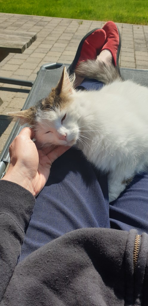 Sinds deze kastaard uit het huis is gebannen (nieuwe zetel, remember) vindt hij “het gat schoon” om nog eens te komen shnugglen als ik me buiten op de ligstoel nestel om naar The Tiny Podcast van Hade te luisteren. Een aanrader! Ik volg trouwens ook een online cursus bij Hade waarbij ik dagelijks word gevraagd om bij een aantal zaken iets meer stil te staan. Frankie trok het zich niet aan en draaide zich ronkend nog eens op zijn zij.