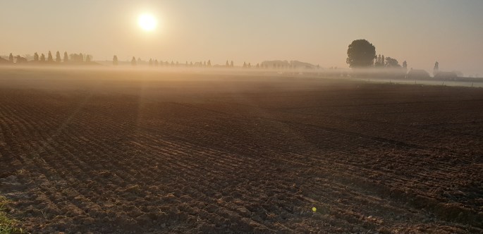 6u24 na een kwartiertje doorstappen sta ik bijna aan rand van de gemeente waar ik woon. De velden zijn netjes bewerkt. De tussenfase waarin landbouwers met man en tractor alles klaarstomen voor het volgende seizoen is misschien niet fijn voor mijn tere oren maar het zorgt wel voor strakke vergezichten.