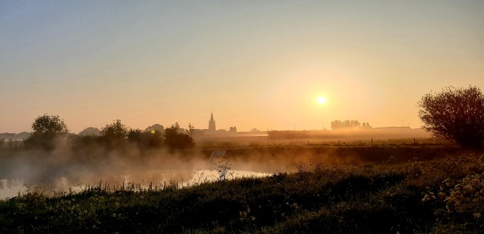 7u10 de zon vergezelt me op de terugweg. In een mum van tijd staat ze boven aan de hemel. Er wordt me geen rustige zonsopgang gegund vandaag. Op de akkers verdampt de nacht.