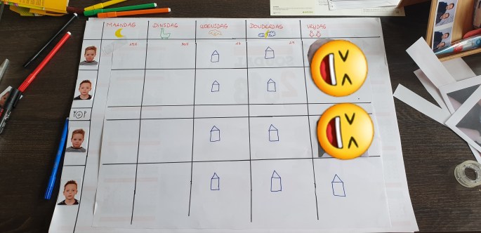 • Visualisatie is key: tijdens vakantieweken maak ik een weekplanning op, mijn kinderen hebben geen sikkepit inzicht in de week en om te vermijden dat ik dagelijks moet uitleggen welke dag ze nu die bepaalde playdate hebben of naar de opvang gaan maak ik een weekkalender. Aangezien Linus nog niet kan lezen gebruik ik dezelfde symbolen als in de klas. (Ok, ik werd misschien wel uitgelachen om mijn tekentalent maar dat neem ik er graag bij!)