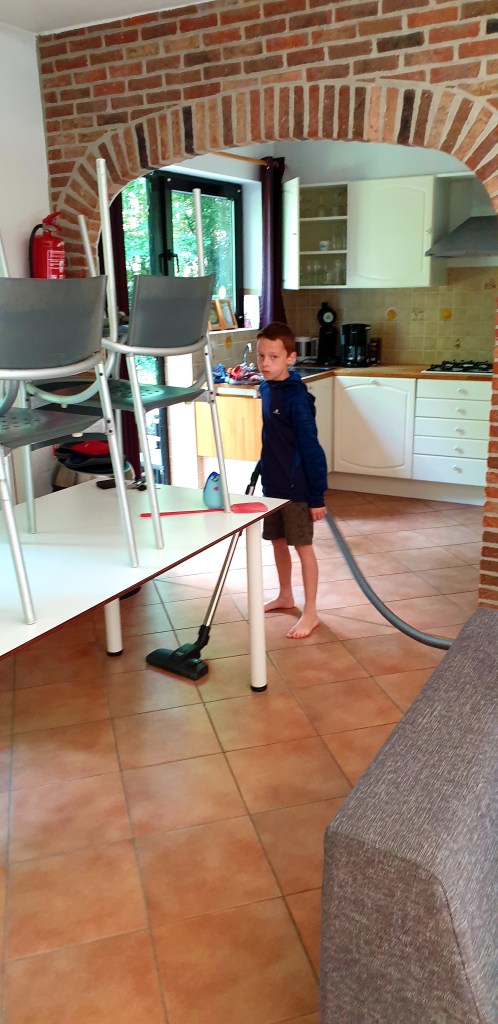 Ook op vakantie lijken kruimels zich te vermenigvuldigen terwijl we erop staan kijken. Ook op vakantie ontsnappen de kerels dus niet aan huishoudelijke taakjes. Naar het enthousiasme hoeven we niet te polsen, het gezicht spreekt boekdelen.