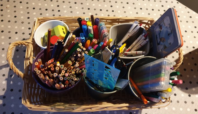 De voorbije week zag ik in een instastory een unboxingvideo waarbij iemand een doos Bics opende. Zeventien verschillende bics met vier kleuren. Er kwam letterlijk speeksel in mijn mond toen ik al die prachtige stylo’s naast elkaar zag blinken. Je kan je niet voorstellen hoeveel balpennen, stiftjes en potloden ik heb liggen, in de meest gevarieerde kleuren en maten! Ik minimaliseer ze niet omdat ik ze ook effectief gebruik maar ik ben het ondertussen ook afgeleerd om ze te kopen. Gisterenmiddag toen het hier 38 graden tekende ben ik eens samen met Linus door hun arsenaal gegaan en wat niet meer marcheert vloog eruit. Onderstaande foto is dus hùn gerief, het mijne staat hier nog niet eens bij! (En dan spreek ik nog niet over de onaangeroerde pakjes stiften in mijn schuiven).
