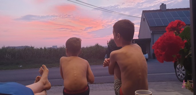 Nadat ik om 6u de echtgenoot uitzwaai bij het vertrek naar zijn vroegdienst neem ik de koffiekan bij me op de dorpel. “Up de zulle up me gat” zingt Flip Kowlier. De koelte van de voordeursteen doet deugd en ik krijg er een pastelkleurig palet gratis bij. Ik hoor de kinderen fluisteren in bed tegen elkaar waarop ik ze bij me roep om samen de zonsopgang te volgen. Terwijl we staren tel ik hun rugwerveltjes.