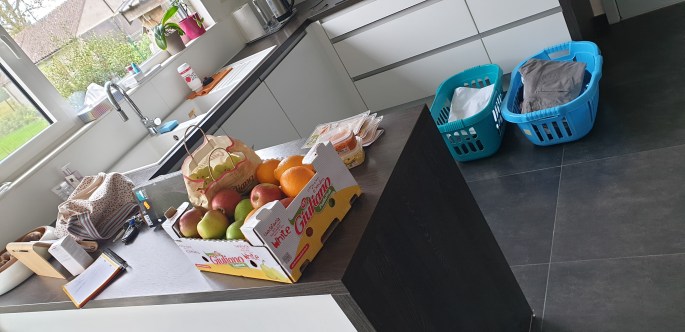 Het is ineens 14u15, het fruit wordt in de schuif in de frigo gekapt terwijl ik de tomaten voor soep uithaal. Terwijl de wind rond het huis suist voel ik een hongertje opkomen. Ahja, juust, ik at nog niets vandaag. Ik test meteen of de clementinetheorie van de fruitwinkel klopt en schenk ondertussen mijn koffie uit. Deze vrije dag is al halfweg en ik heb het gevoel dat ik nog niets heb verwezenlijkt. Straks haal ik de kinderen uit school en is er nog geen eens verse soep op tafel. Maar: mijn lampje werkt, er is fruit dat gemakkelijk pelt en de muziek zit al heel de dag goed. Mijn auto ruft nog altijd maar ik heb een nieuwe afspraak en de koffie smaakt. De soep zal straks ook wel op het vuur geraken en die was draait zichzelf wel.