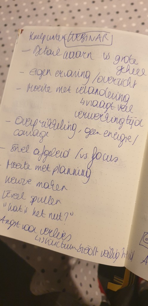 Bij Nele Colle volgde ik een webinar over “Opruimen en organiseren met mensen met ADHD en autisme”. Ik dacht dat zoiets wel zou bijdragen aan mijn werk bij jongeren met deze problematieken. Over het opruimen en organiseren zelf heb ik niet zoveel bijgeleerd aangezien ik dat weinig doe, ik minimaliseer wat ik niet meer nodig heb in plaats van het een gelabeld plekje te geven. Hoewel ik al wat ervaring heb in werken met mensen met autisme en/of ADHD is het vooral interessant om te weten hoe dit is voor mensen zonder verstandelijke beperking. De meeste mensen die de webinar volgden waren effectief mensen met autisme en/of ADHD, het gaf een interessante inkijk in hoe zij de wereld ervaren en dat maakte de avond wel leerrijk voor mij. Aan het gekrabbel in mijn Bullet Journal kun je zien dat ik de webinar in de zetel onder een sarzeke volgde.