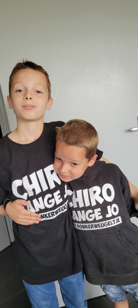 Mijn twee zonen in de Chiro zojuist. Je-m’en fout-Ilja en supersensitieve Linus zijn vandaag voor het eerst samen weg. Ilja heeft het pad gelukkig al vereffend voor kleine broer waardoor de overstap voor hem iets vlotter loopt. En ik….ik geniet van de rust uiteraard. Waarom denk je dat ik anders aan mijn bureau zit met een koffietje….