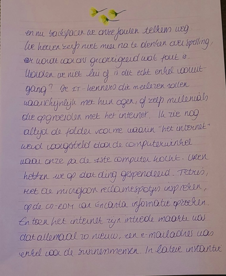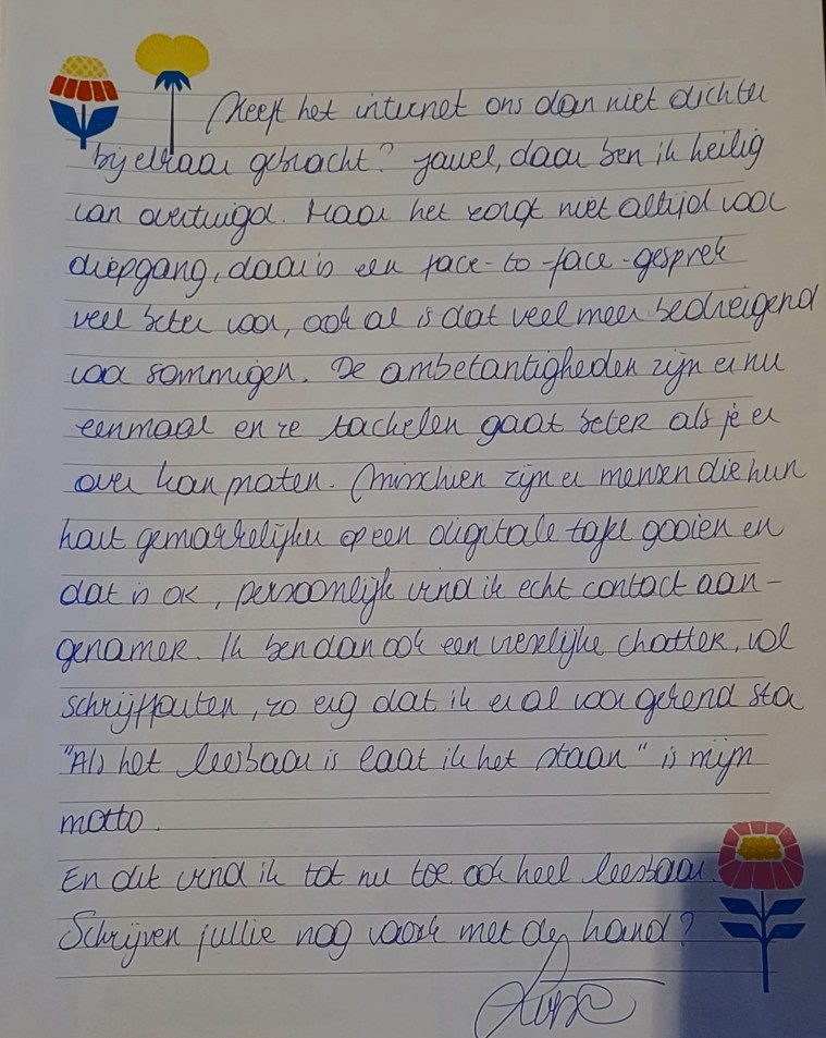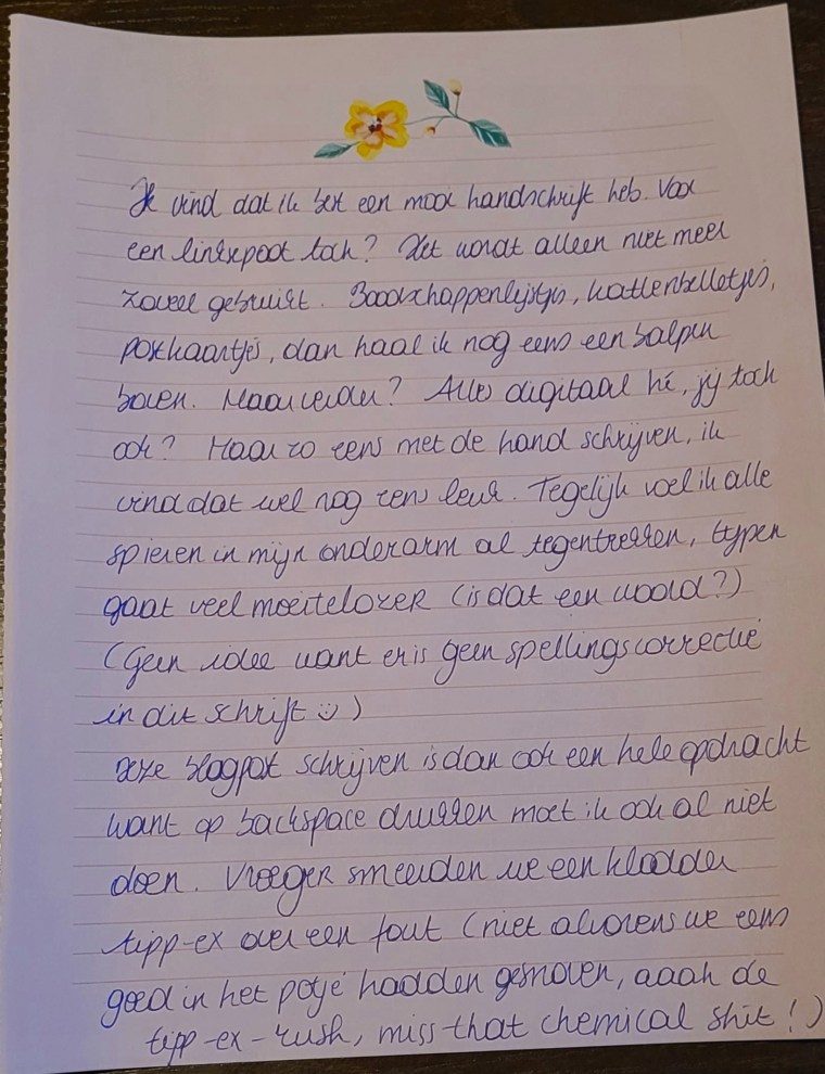 Mooi handschrift. Zo’n lange boterham heb ik al in geen jaren meer geschreven. Boodschappenbriefjes, kaartjes met wat tekst, dat zal het zowat zijn.