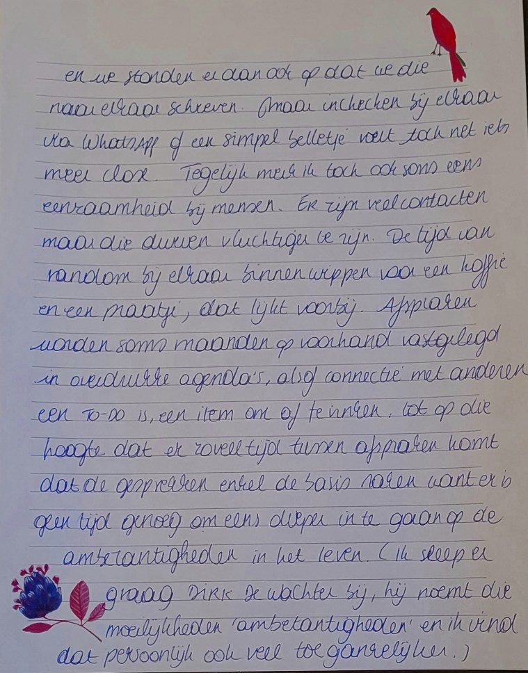 En heb de indruk dat ik nu met Corona nog minder met de hand schrijf, vroeger durfde ik al eens feedback op het werk met de hand bij een afgeprint document schrijven en dan kon ik dat meegeven, maar nu heel veel dingen digitaal zijn, lukt dat minder want dan zou ik daarna nog eens alles moeten overtypen.