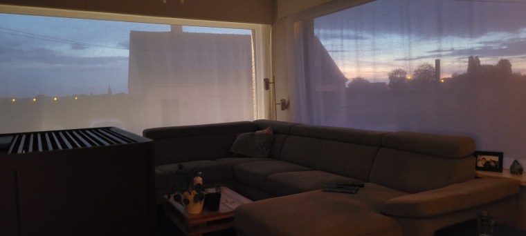 Achter me staat een wasrek met enkele truien die gisteren niet droog waren aan de molen buiten. In de zetel is de iPad en het bakje van de televisie blijven liggen gisterenavond.