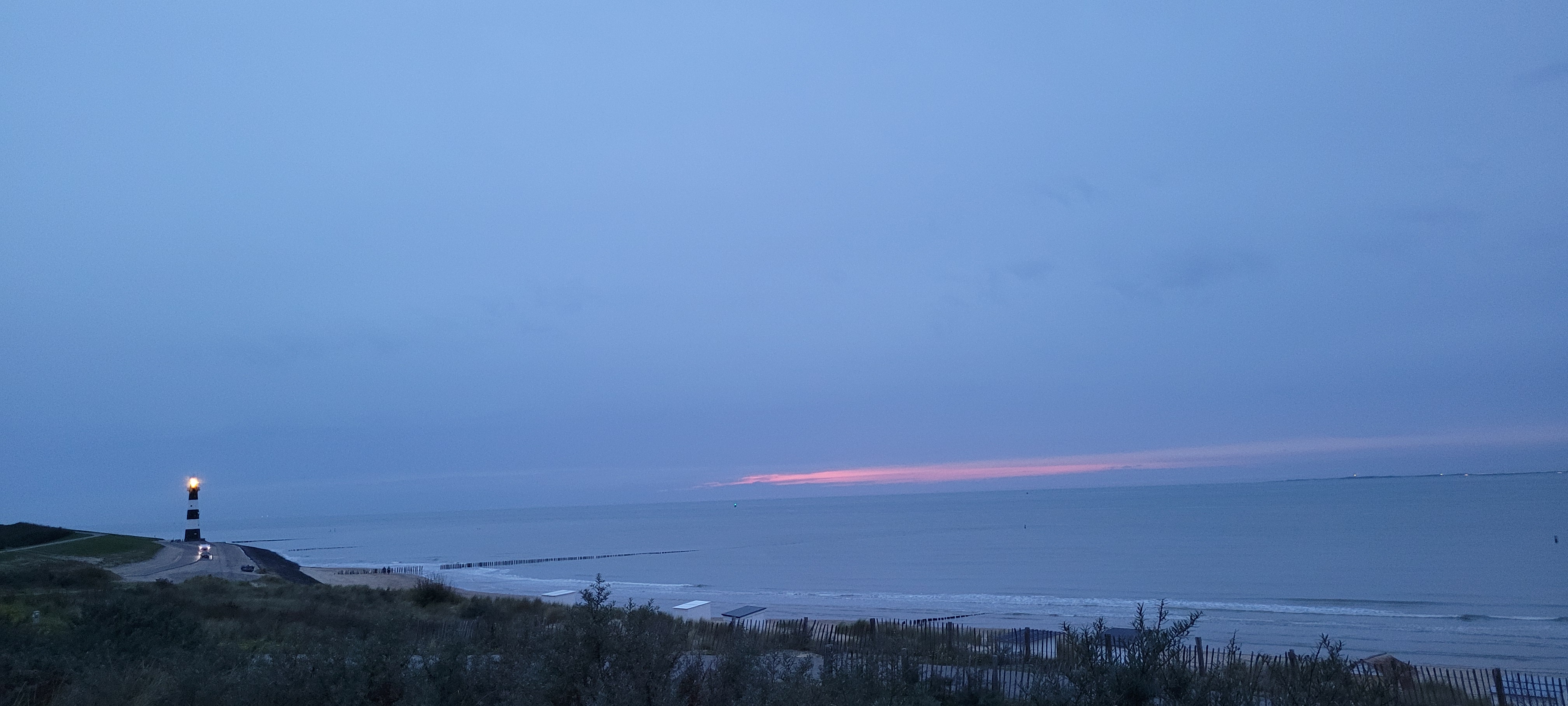 Er wordt me geen spectaculaire zonsondergang gegund. Het lampje knipoogt me vaarwel als ik het strand verlaat.