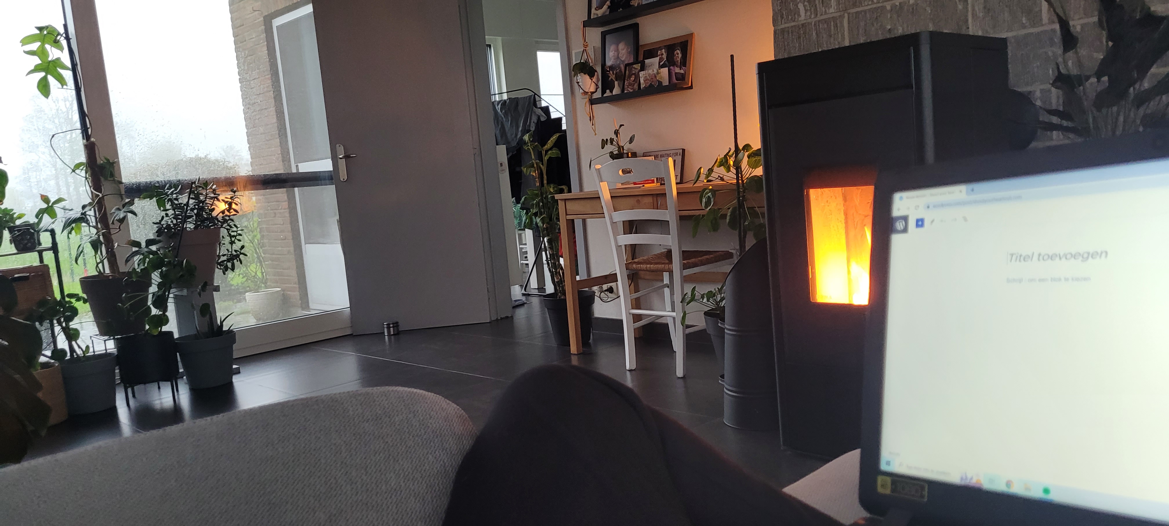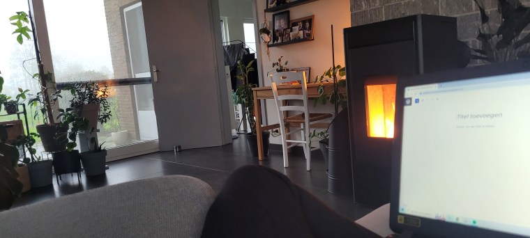 De brandende kachel voor me en de TV staat op maar er speelt niets, enkel het Google startscherm brengt wat kleur in het beeld. Er staat een weekendwasje te drogen op het wasrek en het huis is proper want ik heb een dweiltje gesmeten.