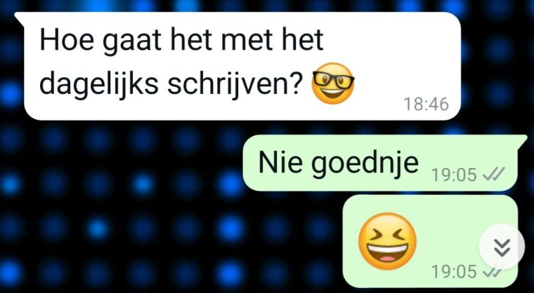 Een schuldgevoel omdat je in de veelheid van het leven niet iedereen evenveel aandacht kan geven. Tekortschietschuldgevoel klinkt veel te lang maar dat belichaamt wel een beetje wat ik bedoel. Ik ben razend benieuwd naar het leven van de mensen rondom me maar ik ervaar ook dat ik te weinig tijd heb om overal up-to-date te zijn. Diepere gesprekken blijven soms in concept staan. Ik weet dat je tijd moet nemen totdat de diepere laag van iemand kan geraakt worden in een gesprek. Ik ben ook verre van een goeie smalltalker, het weerbericht en de krantenkoppen kunnen mij gestolen worden. In een gesprek durf ik ook wel de confrontatie aan te gaan met iemands’ tegenstrijdigheden waardoor het misschien wel eens een uitdaging kan vormen en niet altijd een luchtige happy happy joy joy-boel is.