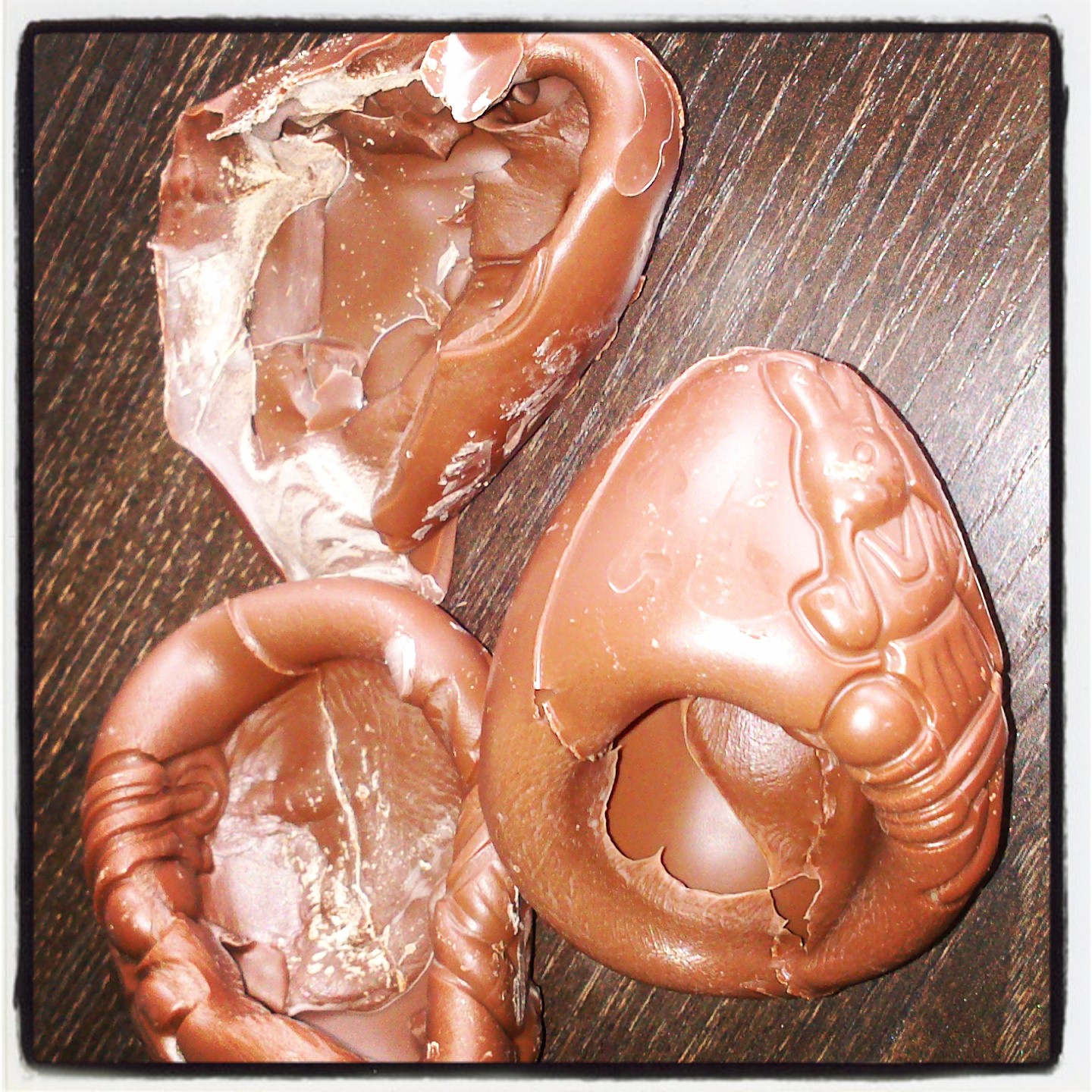 Zwarte brokken. Inderdaad: aangebrand. Ik doe er niet om, echt niet. Ik giet het hele goedje in het toilet. Even later ruikt het daar alsof een chocoladefiguurtje zijn gevoeg deed.