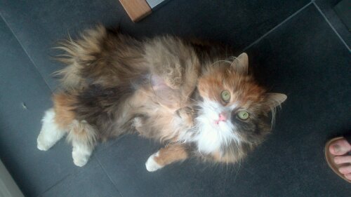 Deze mustiekat amuseert zich ook te pletter, marbelwentelen over onze vloer.