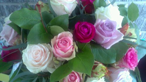 Deze rozen kreeg ik deze week van mijn schoonouders, geleverd aan de deur! Inclusief een vaas, dus geen gefriemel met het juist snijden van de steeltjes. Gewoon uitstallen en heel content naar zitten kijken.