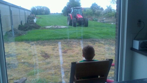 Hoewel we genieten van het oeverloos zappen is het helemaal niet nodig voor Ilja. Hij zet zich in zijn stoel en kijkt naar de achterbuur die zijn gras invet. Geen TV nodig dus. “TRACTOR!!!!!” Wacht tot diezelfde buur zijn parapontjes uithaalt en zijn mooie gras beparapont!
