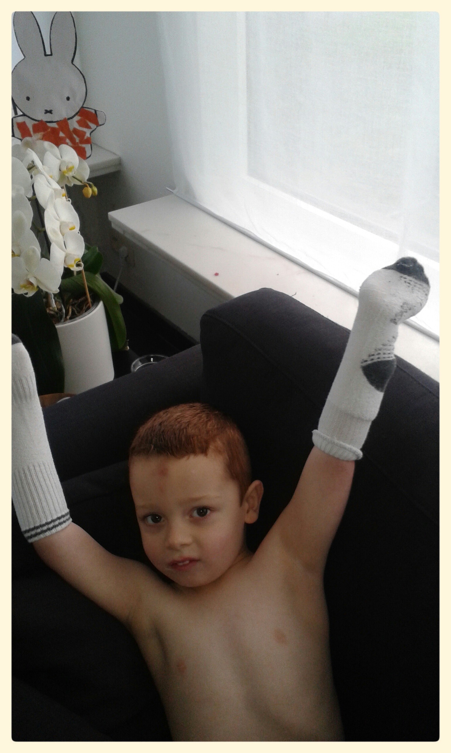 Als Pieter thuiskomt -veel later dan voorzien wegens een platte band- vertrek ik op mijn loopje. Ik zit aan de iets “zwaardere” lessen (vier keer 8 minuten lopen) maar het gaat nog steeds goed. En het blijft deugd doen. Na het afspoelen van bakhitte, babyspuug en loopzweet zie ik er om 13u zo uit: