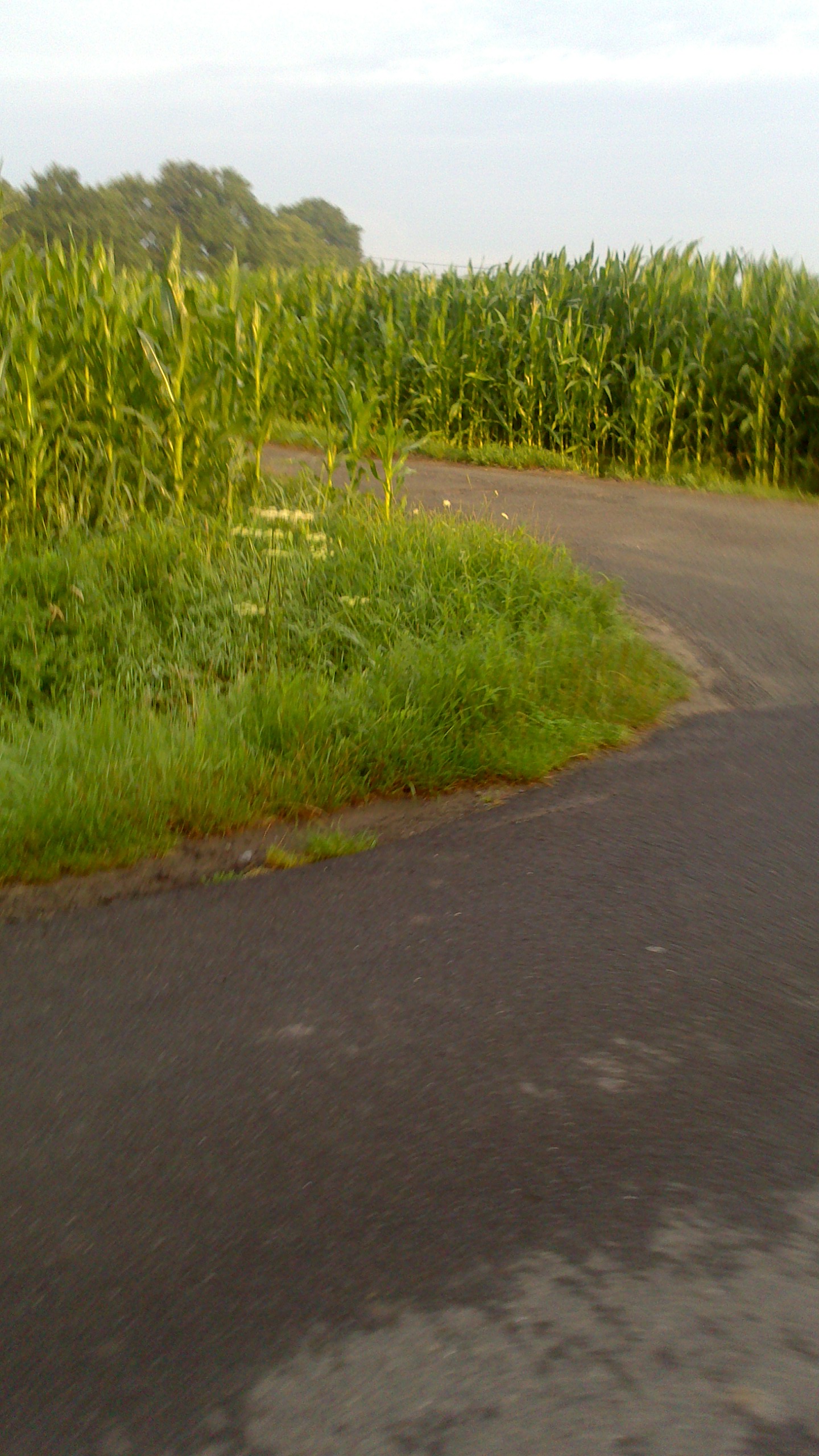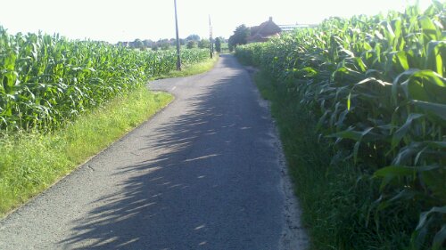 Hier kan ik tussen de mais linksaf slaan om een shortcut te nemen. Ik doe het niet en hou dapper vol voor een extra 500 meter.