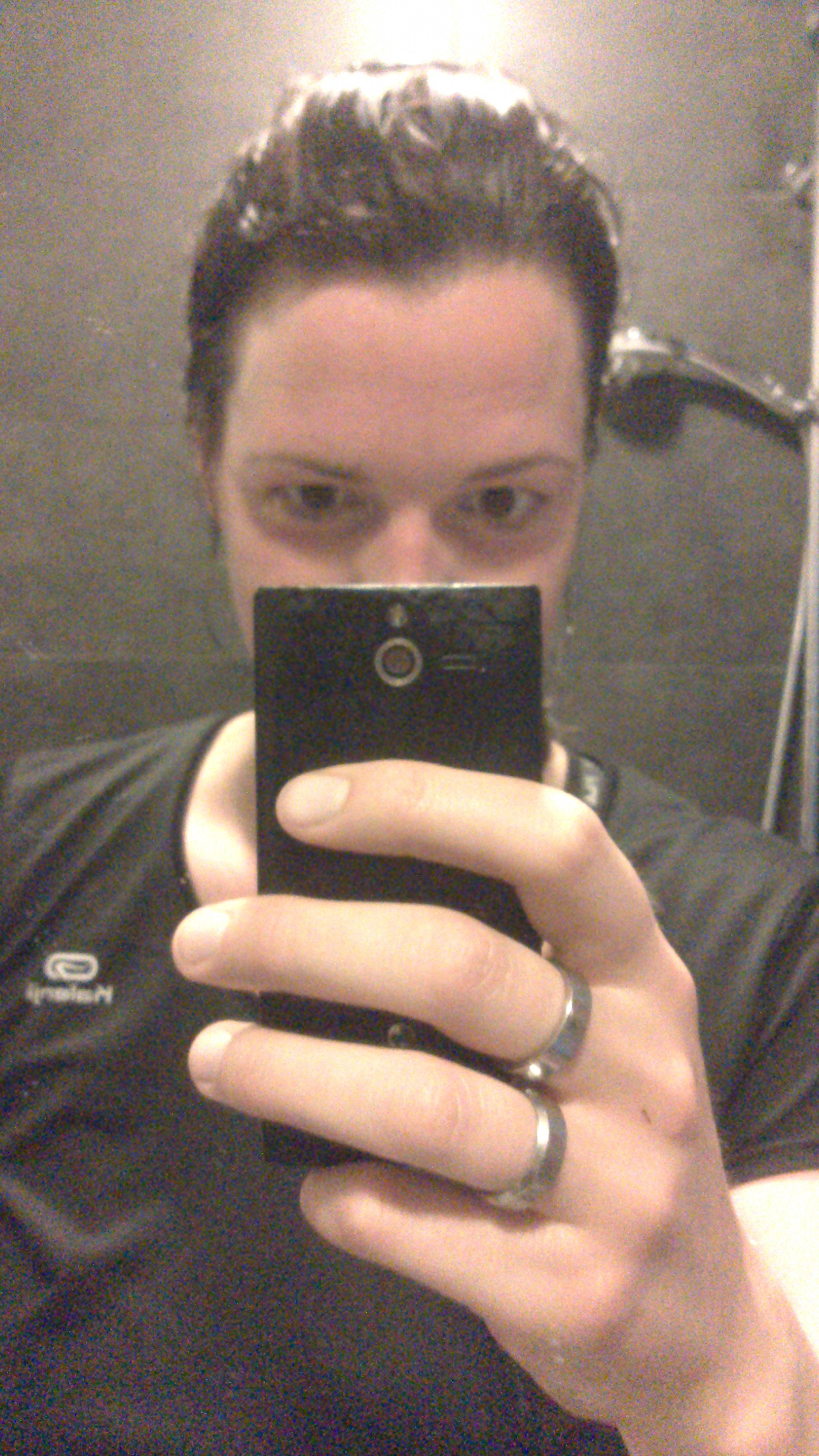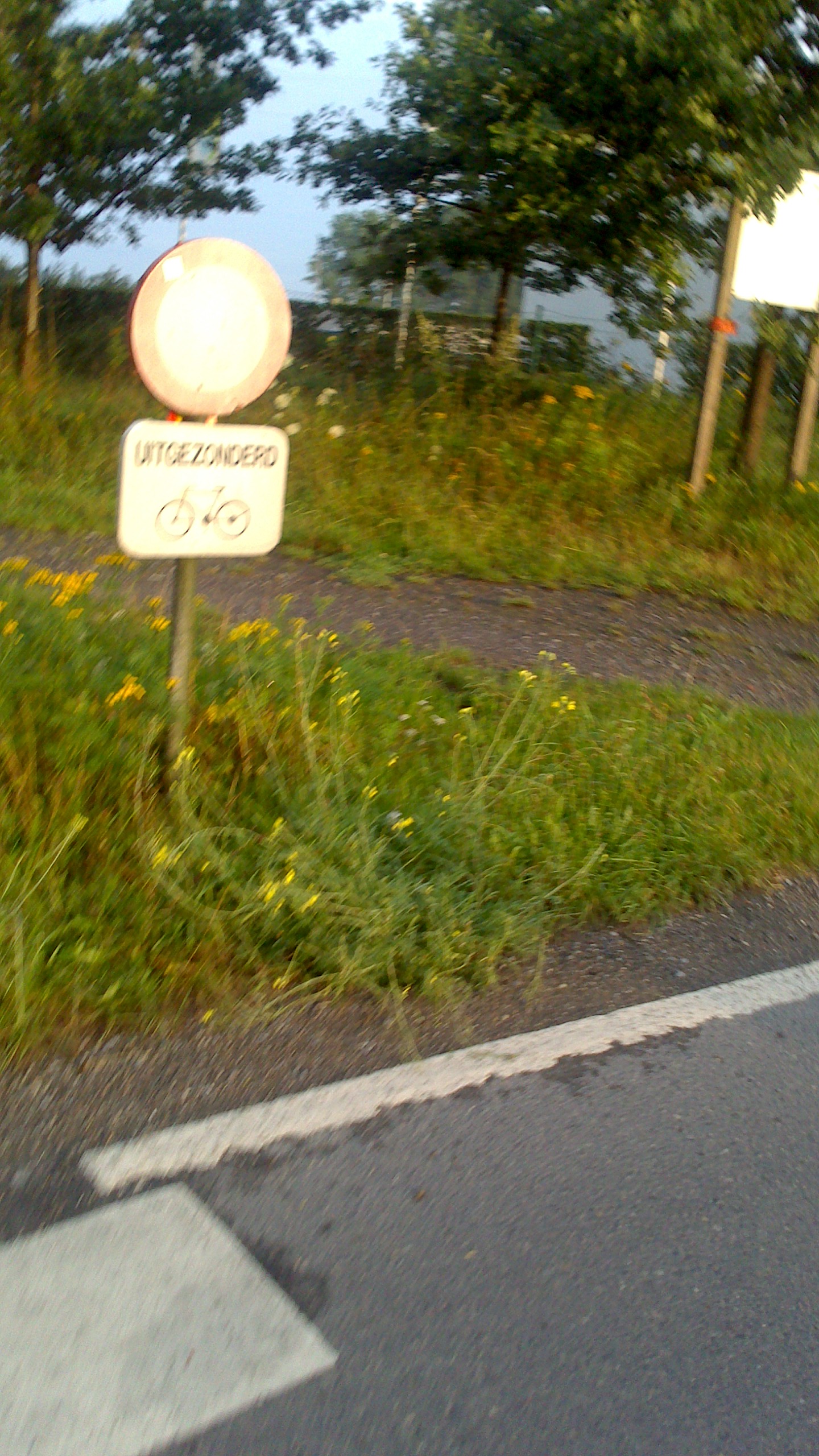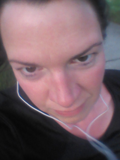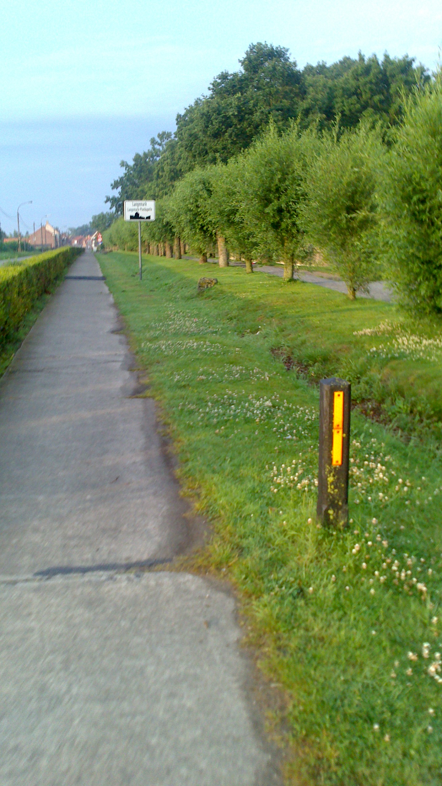 Zo zie ik eruit na 1 km. De planten in de berm slaan tegen mijn blote kuiten en laten een spoor van dauw na. Verfrissend!
