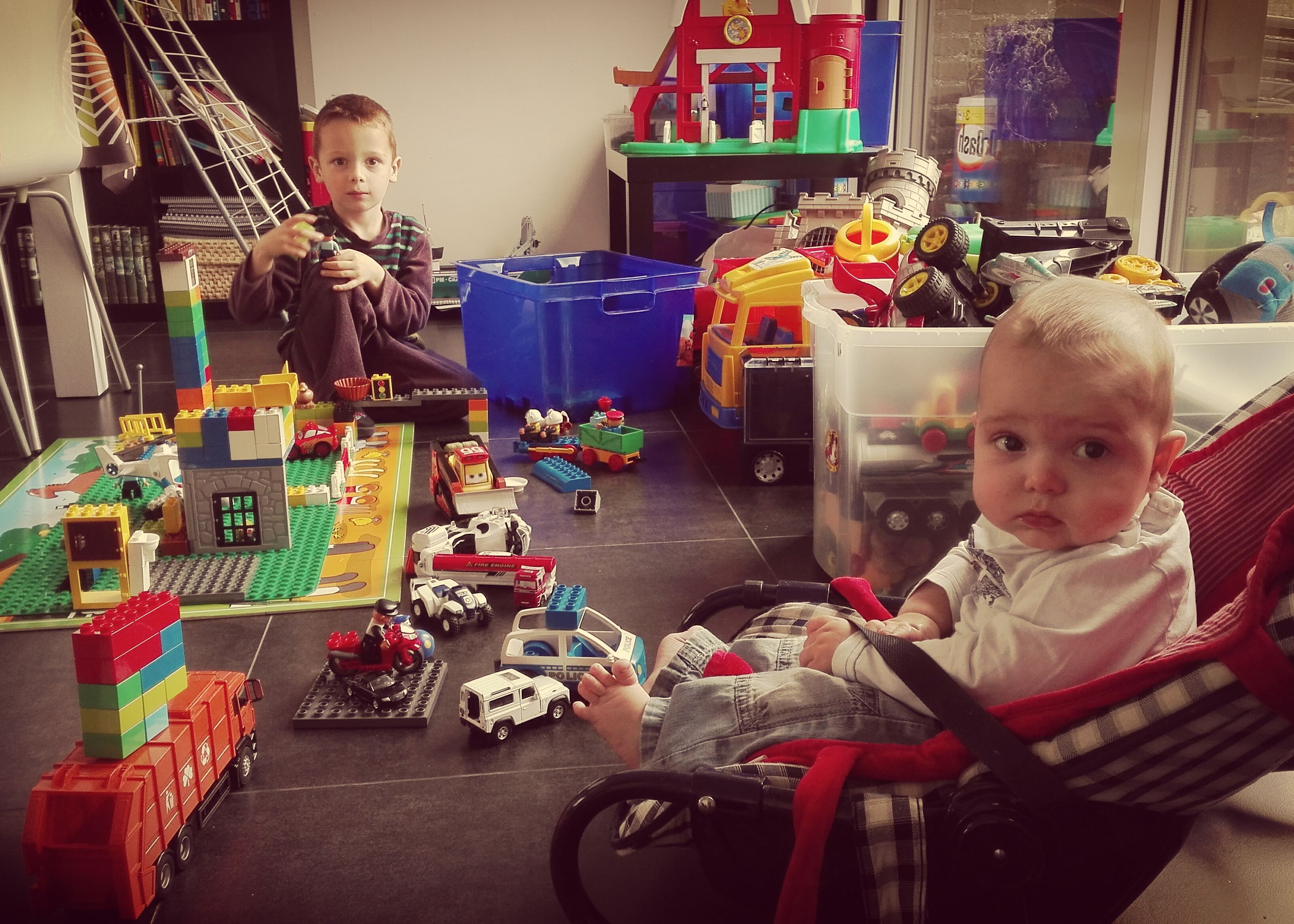 Linus houdt ook een concertje en geeft mij de grootste glimlach ever als ik hem uit zijn bedje haal. Ilja blijft verder spelen met verschillende speelgoedjes door elkaar. Hij gaat op in zijn fantasiespel “Dankuwel omdat je zo’n mooi politiekantoor hebt gebouwd! Het is graag gedaan, boef!”. Linus volgt het een beetje kwijlend maar met grote ogen. Aan het wasrek hangt wat halfdroge was, ik herverdeel het over de halfwarme chauffages.