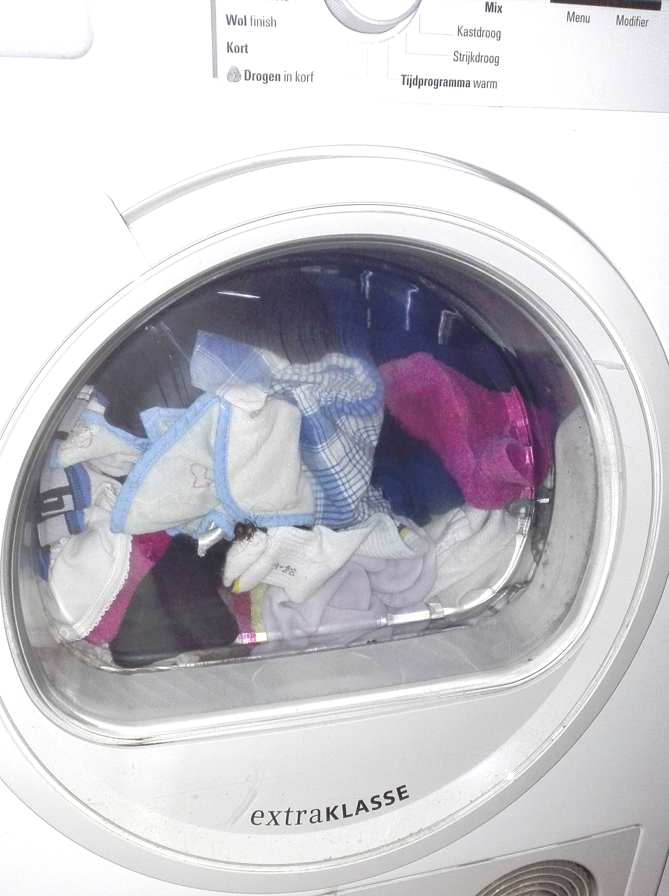 Minder vrije tijd. Ik probeer (zeg wel: probeer) om de dingen meer direct te doen. Had ik dat gelezen in “Getting things done”? Ik weet het niet meer, het boek was al oud toen ik het las en ik heb het nooit uitgelezen omdat ik het niet zo leuk vond. Maar alles wat ik in 5 minuten kan verwezenlijken doe ik zo goed als meteen. De vaatwas legen om 22u terwijl ik eigenlijk aan het smachten ben naar mijn kopkussen, toch maar even vlug doen. Zo krijg ik de volgende dag geen aanrecht vol vuile koffietassen. De was ophangen om 7u ’s morgens, vlug even doen, dan kan ik dat misschien de volgende dag al in de kasten leggen. Maar hey, soms staat mijn was een hele week droog naar mij te gapen. Dat gebeurt ook. En dan gaap ik terug. Even droog.